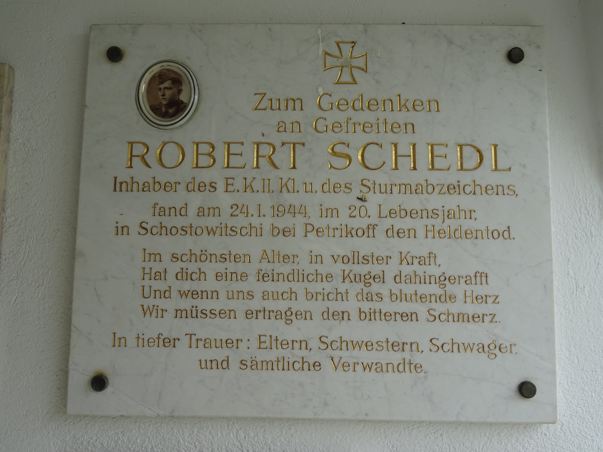 Gefreiter SCHEDL Robert, † 24.01.1944 im 20. LJ. in Schostowitschi bei Petrikoff, Inhaber des E.K. II. Kl. u. des Sturmabzeichens